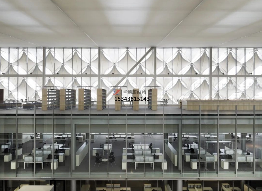 膜結(jié)構(gòu)頂棚是一種現(xiàn)代化的建筑形式,利用高強(qiáng)度柔性薄膜材料與支撐體系相結(jié)合,形成具有一定剛度和獨(dú)特曲面的覆蓋結(jié)構(gòu)。這種結(jié)構(gòu)不僅美觀大方,而且具有良好的透光性和節(jié)能效果,適用于各種公共建筑,包括圖書館。