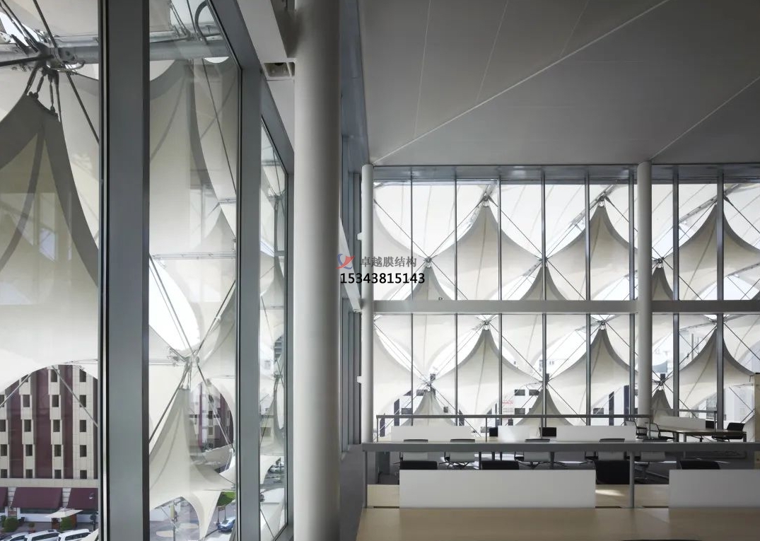 膜結(jié)構(gòu)頂棚可以有效地遮擋陽光和雨水,為圖書館內(nèi)部提供一個(gè)舒適的環(huán)境。同時(shí),膜材料的透光性也可以保證室內(nèi)有足夠的自然光線。
