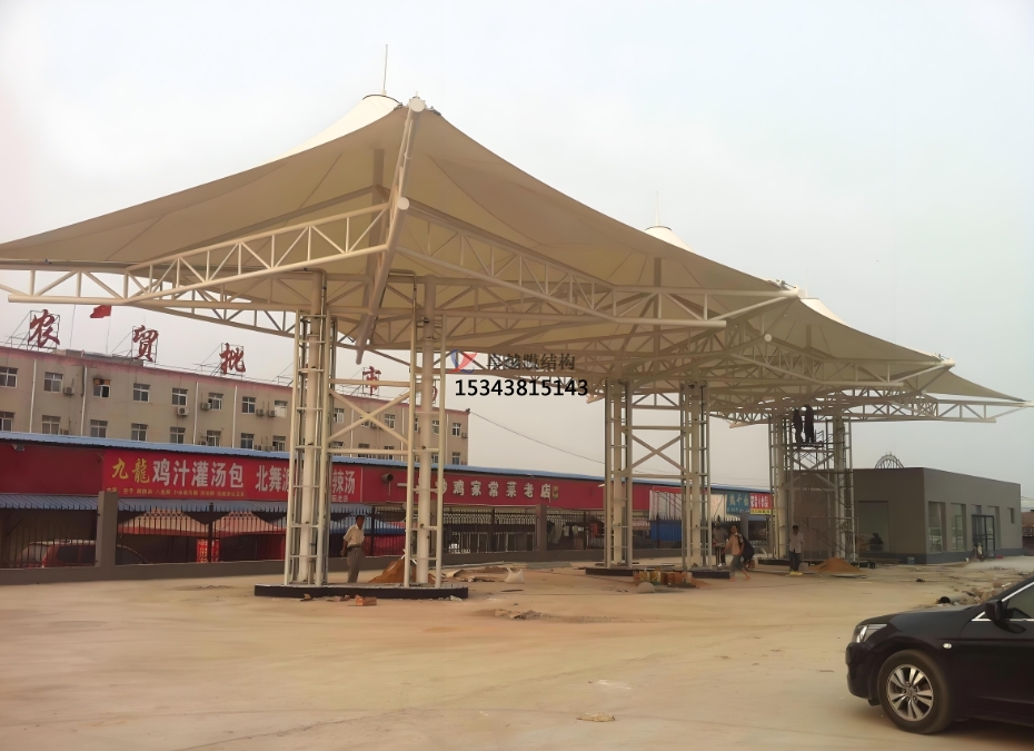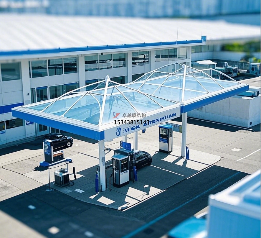 支 撐系統(tǒng)則根據加油站的規(guī)模和設計需求,選用鋼結構或鋁合金結構。鋼結構支撐具有較高的強度和穩(wěn)定性,能夠適應各種復雜的地形和氣候條件,通過合理的力學設計,將膜材所承受的荷載均勻傳遞至基礎。鋁合金結構則以其輕質、耐腐蝕的特點,在一些對重量有嚴格要求或環(huán)境較為惡劣的地區(qū)備受青睞,減輕了基礎的承載壓力,同時降低了維護成本。