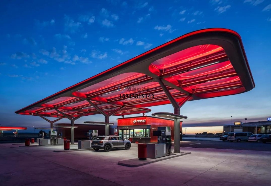 豐富的色彩選擇:膜材可以根據客戶的需求,染成各種不同的顏色,滿足加油站對個性化和品牌形象展示的需求。通過色彩的搭配和組合,能夠營造出不同的氛圍和視覺效果,提升加油站的整體形象和辨識度。例如,一些知名品牌的加油站,通過采用統(tǒng)一的膜結構罩棚顏色和造型,強化了品牌的視覺識別度。