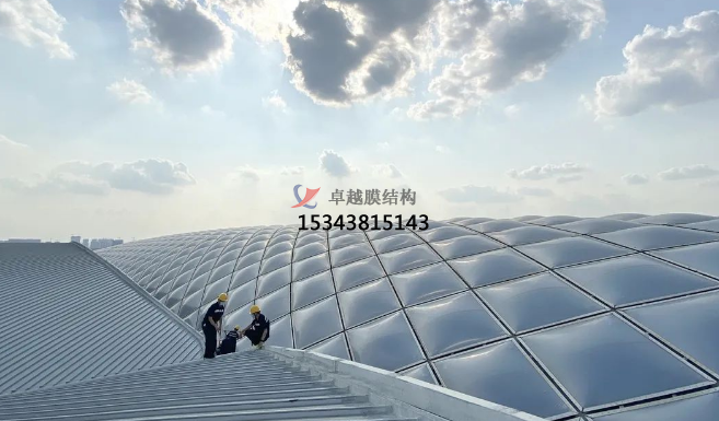 每張膜內設一條充氣管道,氣壓不足時隨時進行補氣,以保持飽滿鼓脹的狀態(tài).形成透明的氣枕實現良好的采光效果.天窗采用對角線網格的鋼筋結構,以拱頂形式呈現并鑲嵌ETFE氣枕,使得自然光可照入候車大廳,