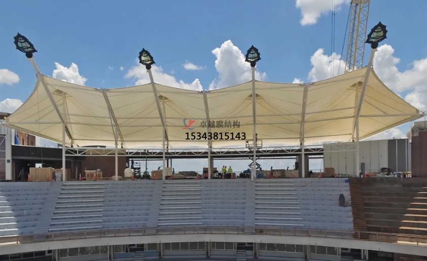 • 遮陽擋雨:膜結構罩棚能夠有效地遮擋陽光和雨水,為觀眾提供一個干燥、舒適的觀賽環(huán)境。特別是在夏季高溫或雨季時,罩棚的作用更加顯著。