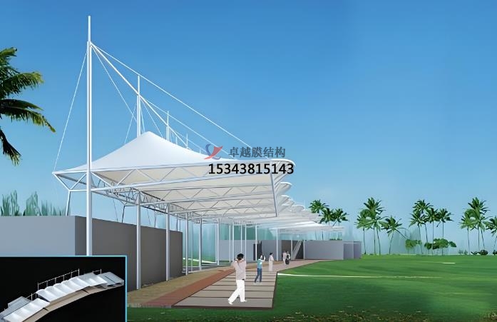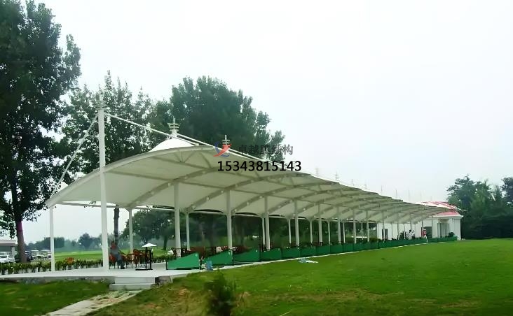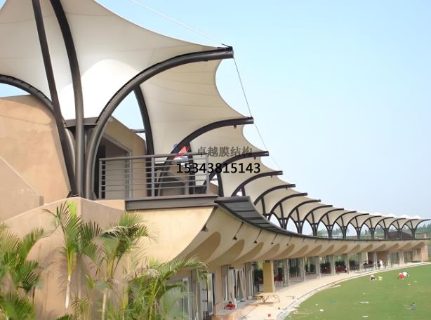 應(yīng)用場景:發(fā)球臺罩棚,看臺與觀賽區(qū),停車棚與配套設(shè)施,景觀與休閑區(qū)。發(fā)球臺罩棚為球員提供遮陽、避雨的空間,造型靈活美觀,與球場自然環(huán)境融合??磁_與觀賽區(qū)大跨度膜結(jié)構(gòu)看臺可覆蓋大量觀眾,輕量化設(shè)計降低基礎(chǔ)成本,同時具備通透視野。停車棚與配套設(shè)施則保護(hù)車輛免受紫外線、雨水侵蝕,常見于高爾夫球場入口或停車場。景觀與休閑區(qū)膜結(jié)構(gòu)為小品、廊道等提升球場景觀性,營造現(xiàn)代感。