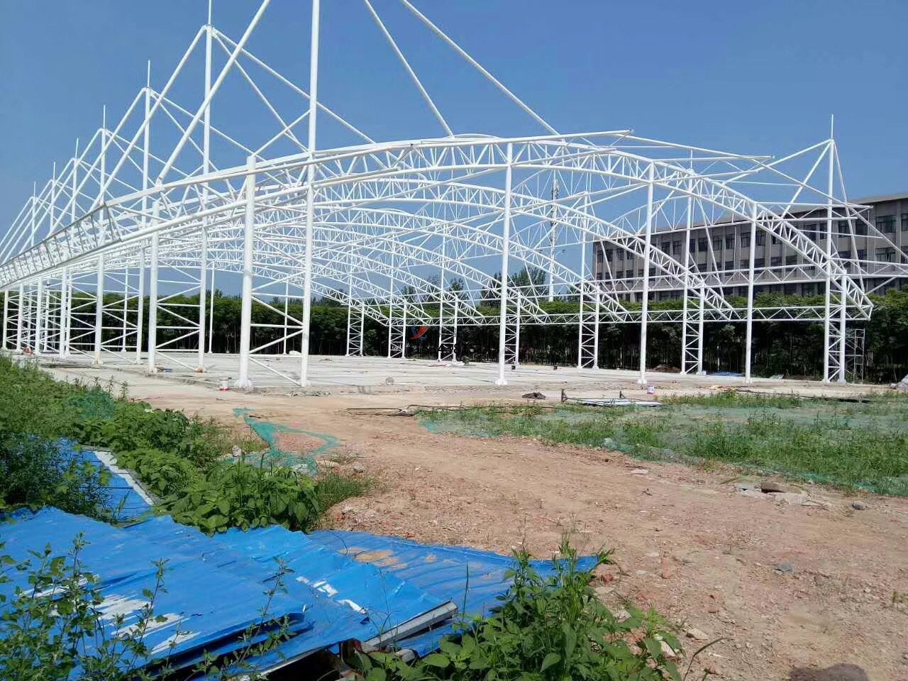 籃球場膜結(jié)構(gòu)工程施工流程與關(guān)鍵技術(shù):其流程包含支撐結(jié)構(gòu)安裝(以鋼結(jié)構(gòu)為例)、膜材加工與安裝、 膜面張拉與調(diào)整、節(jié)點處理與防水密封。在關(guān)鍵技術(shù)點中,支撐結(jié)構(gòu)的安裝涵蓋構(gòu)件吊裝,按施工順序吊裝鋼柱、鋼梁,使用經(jīng)緯儀和水準(zhǔn)儀控制垂直度和標(biāo)高,臨時固定后進行焊接或螺栓連接。焊工需持證上崗,焊接前清理焊口,采用多層多道焊,焊后進行焊縫探傷檢測(如超聲波檢測),確保焊接質(zhì)量。焊接部位及損傷的防腐層需重新涂刷防銹漆和面漆,涂層厚度符合設(shè)計要求。膜材加工與安裝,膜材的加工需要根據(jù)深化設(shè)計圖紙,在工廠內(nèi)對膜材進行裁剪、熱合(或縫合),形成完整的膜單元。加工完成后進行預(yù)拼裝(預(yù)張力測試),檢查膜面尺寸、形狀是否符合設(shè)計要求,記錄膜材的張拉方向和定位標(biāo)記。然后進行膜材吊裝,采用多點吊裝法,使用專用吊具(如尼龍吊帶)避免膜材損傷,吊裝過程中需專人指揮,確保膜面平穩(wěn)展開。先將膜材邊緣與支撐結(jié)構(gòu)上的夾具臨時固定,再逐步張拉至設(shè)計位置。在膜面張拉與調(diào)整中,首先注意張拉順序,遵循 “由中間向四周” 或 “對稱張拉” 原則,分階段逐步施加預(yù)張力,避免膜面局部應(yīng)力集中。然后是張力控制,使用張力計實時監(jiān)測膜面張力值,達到設(shè)計張力值的80%后暫停張拉,靜置24小時讓膜材應(yīng)力松弛,再進行二次張拉至設(shè)計值。最后是形態(tài)調(diào)整,張拉過程中觀察膜面是否平整,有無褶皺或積水隱患,通過調(diào)整支撐結(jié)構(gòu)的位移或夾具位置優(yōu)化膜面形態(tài)。在節(jié)點處理與防水密封中,膜材與鋼結(jié)構(gòu)連接采用夾具固定(如鋁合金夾具),螺栓間距控制在200-300mm,確保連接牢固。膜材之間的拼接縫采用熱合焊接,焊縫寬度不小于50mm,焊接后進行氣密性檢測。最后進行防水處理,在膜結(jié)構(gòu)邊緣與建筑主體連接處設(shè)置防水卷材或密封膠,防止雨水滲漏。排水坡度需≥5%,確保膜面雨水能迅速排至天溝或地漏。