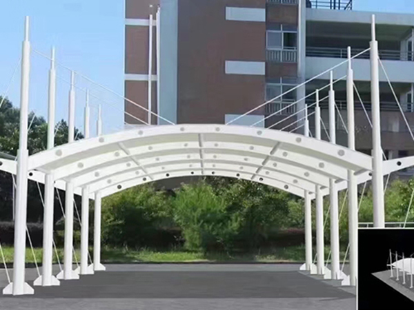 膜結(jié)構(gòu)車(chē)棚的安裝包括膜體展開(kāi)、連接固定和張拉成形三個(gè)部分。除了一般雨蓬不可比擬的耐用、實(shí)用、遮風(fēng)擋雨的功能外,膜結(jié)構(gòu)雨蓬更是一座雕塑,一件藝術(shù)品,給人一種美的視覺(jué)享受。