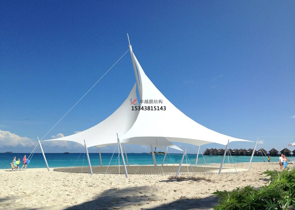 先將地面位置上的雜物和油漬清理干凈, 將突出地面的帶有銳角的硬物剔除;然后將已經(jīng)清洗干凈的保護(hù)膜鋪設(shè)在地面上并拉設(shè)好防護(hù)繩;接著將膜結(jié)構(gòu)景觀工程中需要安裝的膜單元從堆放場(chǎng)運(yùn)至安裝位置;拆除包裝, 將膜單元展開(kāi), 檢查膜單元周邊尺寸, 搭接長(zhǎng)度、開(kāi)孔位置、熱合縫是否符合要求, 檢查膜而是否有破損, 是否有瑕疵, 是否有污染, 合格后進(jìn)入下道工序;末后檢查清理膜單元及鋼結(jié)構(gòu)的觸面, 把殘存的飛濺尖角、物料清理掉并且進(jìn)行打磨光滑。