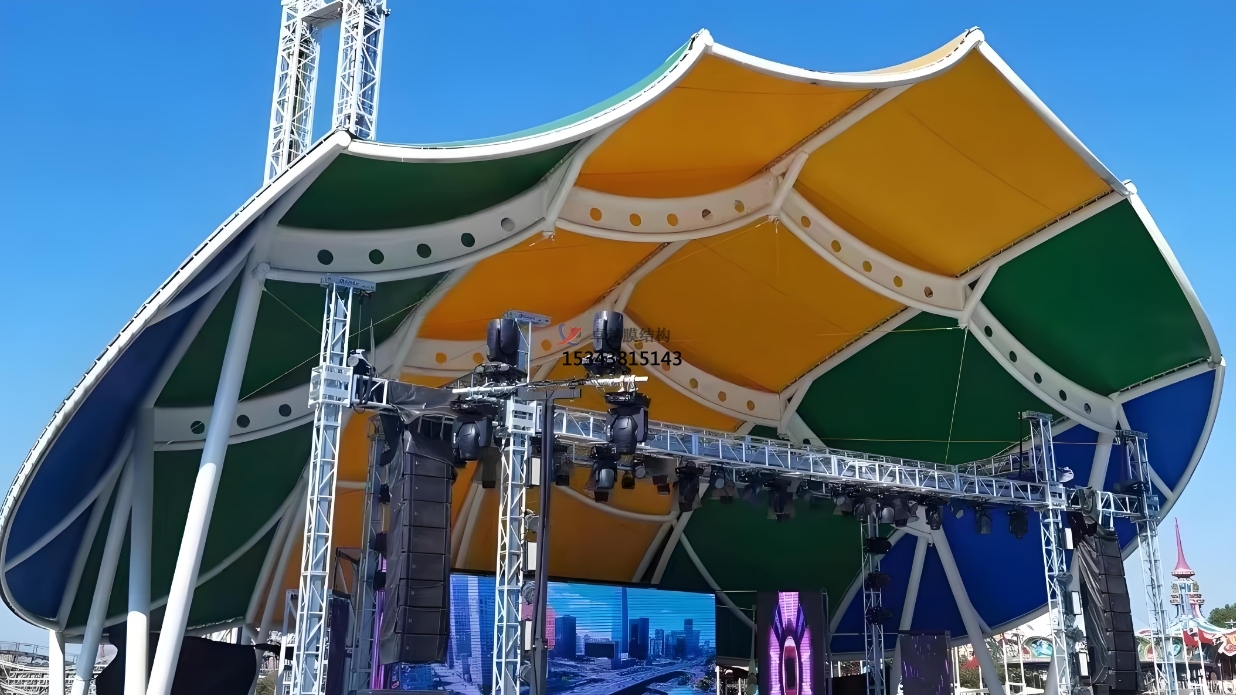 在設(shè)計(jì)膜結(jié)構(gòu)舞臺(tái)時(shí),首要任務(wù)是深入理解演出主題與風(fēng)格。從色彩、造型到整體氛圍營造,都應(yīng)圍繞主題展開。若是一場(chǎng)古典音樂會(huì),膜結(jié)構(gòu)舞臺(tái)可采用簡(jiǎn)潔、優(yōu)雅的白色調(diào),搭配流暢的線條,營造出莊重、典雅的氛圍;而對(duì)于現(xiàn)代藝術(shù)展的舞臺(tái),則可以運(yùn)用大膽的色彩和前衛(wèi)的造型,展現(xiàn)出創(chuàng)新與活力。通過精準(zhǔn)的設(shè)計(jì),膜結(jié)構(gòu)舞臺(tái)成為演出主題的視覺延伸,強(qiáng)化藝術(shù)表達(dá)。