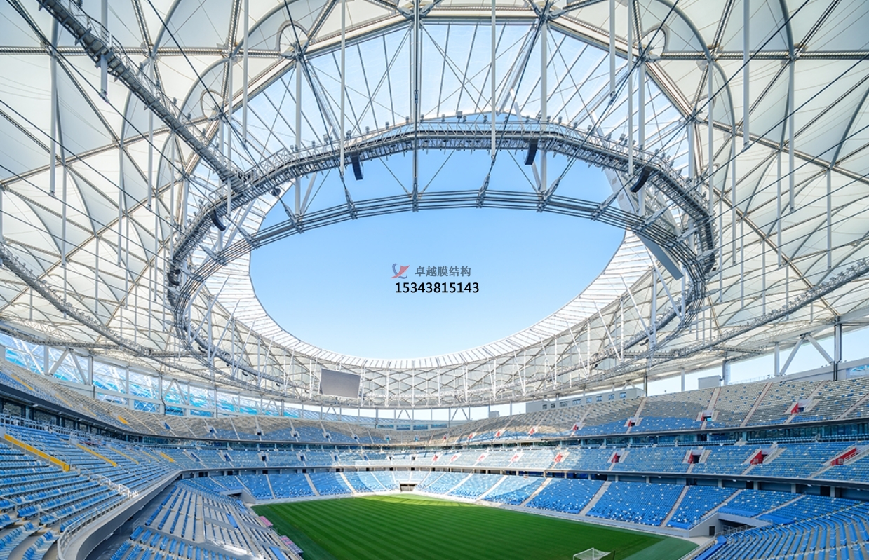 ETFE 膜的柔性特質(zhì)要求支撐結(jié)構(gòu)兼具強(qiáng)度與適應(yīng)性。典型案例如廈門(mén)新體育中心,采用 “巨拱 + 車輻式索網(wǎng)” 體系,通過(guò) 40 榀索桁架與內(nèi)環(huán)索形成三維受力網(wǎng)絡(luò),并在徑向索上方疊加獨(dú)立索網(wǎng),最終以 722 道托膜索與鋁合金槽實(shí)現(xiàn)膜面精準(zhǔn)張拉。這種設(shè)計(jì)不僅滿足了 86 米高空作業(yè)的穩(wěn)定性需求,更通過(guò)曲面造型優(yōu)化了排水效率。