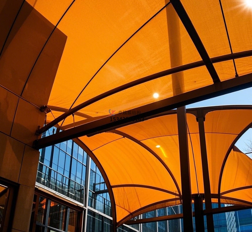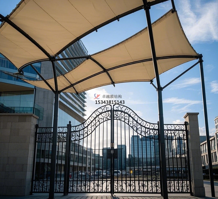 膜結(jié)構(gòu)大門還具備良好的遮陽功能。炎炎夏日,膜材能夠?yàn)榫用駬纹鹨黄鍥龅目臻g,無論是步行進(jìn)出小區(qū)的居民,還是在門口短暫停留等待的人員,都能免受烈日的炙烤。部分膜材具有一定的透光性,在遮陽的同時(shí),還能讓自然光適度透入,使大門內(nèi)部空間明亮舒適,避免因光線不足而產(chǎn)生的昏暗壓抑感。此外,膜結(jié)構(gòu)大門還可以根據(jù)需要設(shè)置一些附屬設(shè)施,如在大門兩側(cè)安裝宣傳欄,用于發(fā)布小區(qū)通知、活動信息等,方便居民及時(shí)了解小區(qū)動態(tài)。