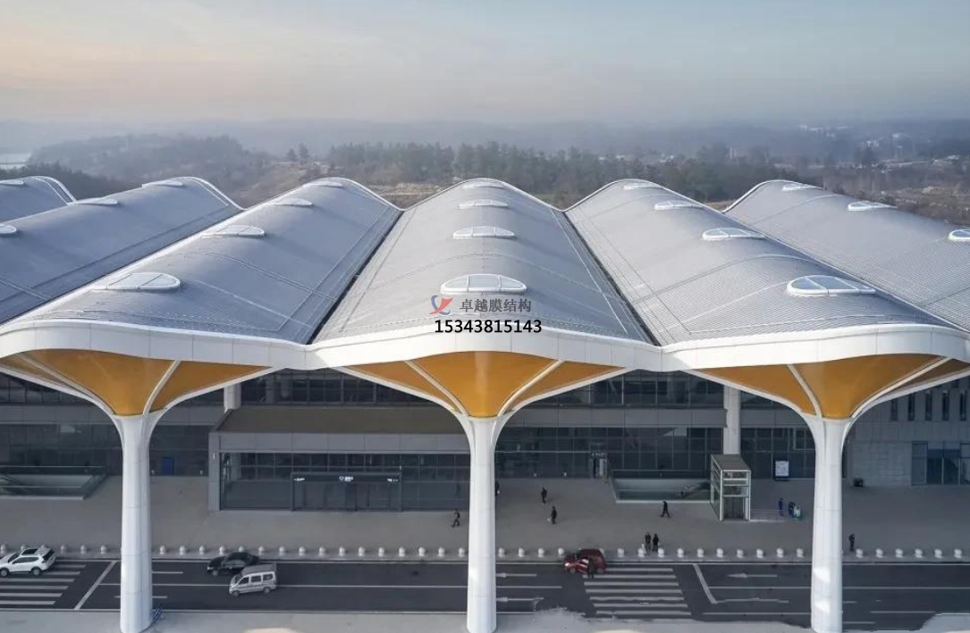 為了抽象表達(dá)出銀杏葉片的形態(tài),隨州南站采用“傘狀單元體”作為主體結(jié)構(gòu)。多個(gè)“傘狀單元體”構(gòu)成挺拔的樹狀結(jié)構(gòu),聯(lián)結(jié)成一個(gè)動(dòng)態(tài)造型的屋面,高低錯(cuò)落的建筑就像交相輝映的古村古樹,體現(xiàn)出建筑結(jié)構(gòu)之美。考慮到透光率、漫反射、金色這三個(gè)基本功能要素,“傘狀單元體”最后采用了