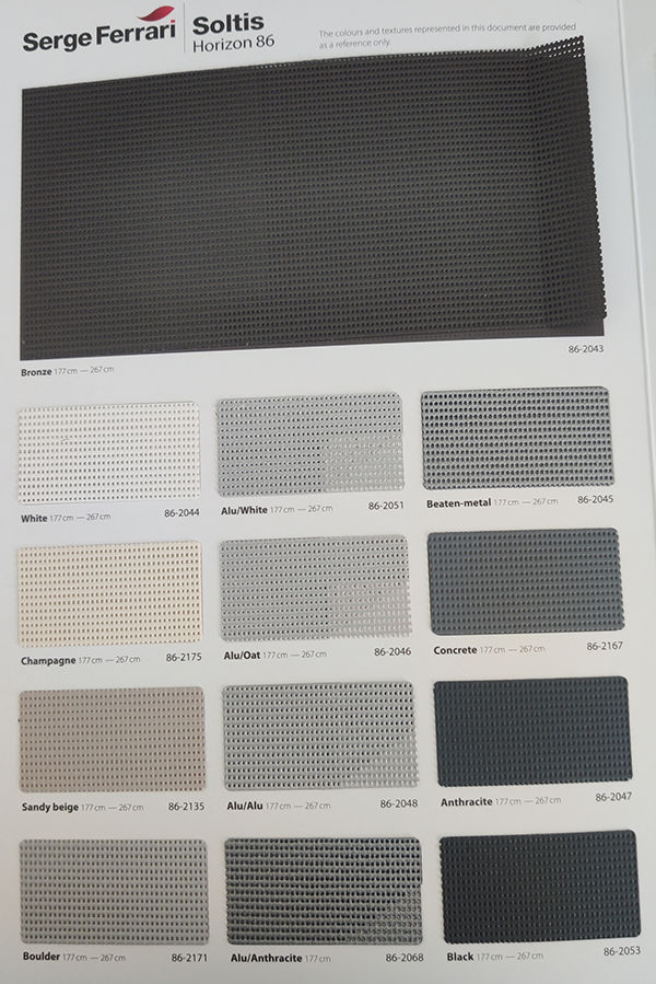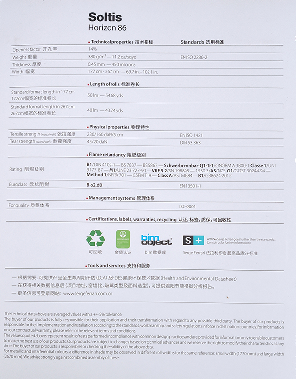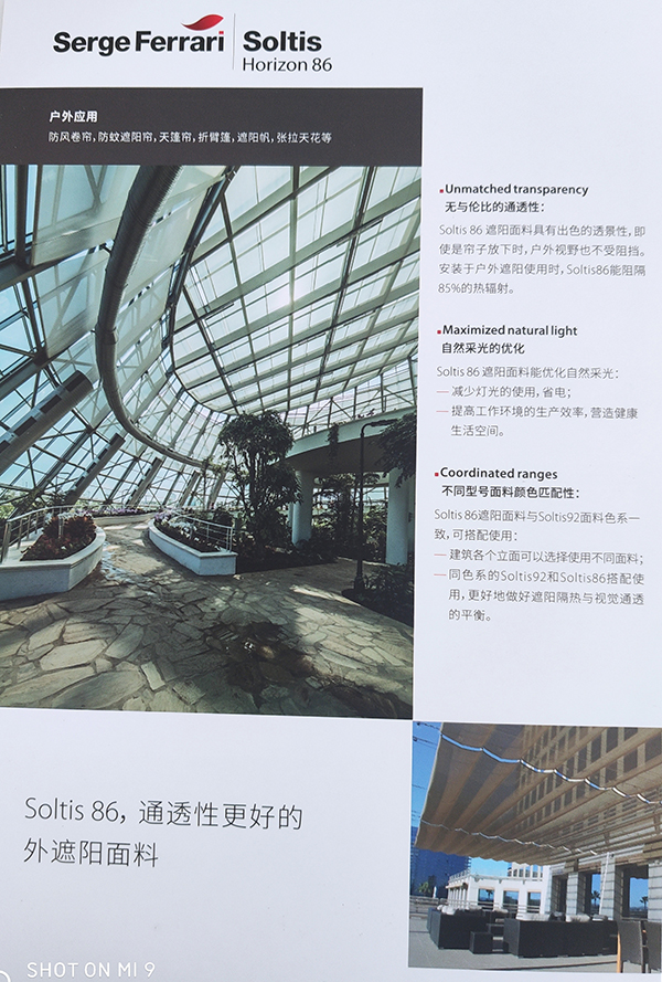 紗帝飾:紗帝飾面料為抵擋熱量和光線的真正盾牌,依靠其微型通風(fēng)結(jié)構(gòu),調(diào)節(jié)陽(yáng)光的熱效應(yīng),有效地防眩目。紗帝飾面料具有46種顏色,可為所有建筑,無(wú)論是 公眾場(chǎng)合還是私人住宅提供配套的眾多色彩和多種用途。法拉利預(yù)應(yīng)力專利制造技術(shù)給紗帝飾織物帶來(lái)尺寸恒定,不會(huì)變形,無(wú)需加固自然抗撕拉,耐久和抗塵,占 地面積小等獨(dú)有特性,更顯出紗帝飾面料對(duì)建筑物技術(shù)性遮陽(yáng)無(wú)可匹敵的優(yōu)勢(shì)。