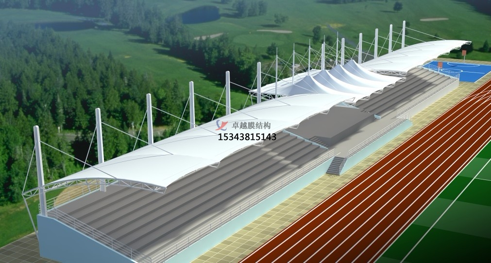 張拉膜看臺主要用于各類地方體育場主席臺雨棚,各類學校體育場看臺雨棚遮蓋,我公司是國內較早從事大懸挑張拉膜結構看臺設計施工的專業(yè)廠家,下面介紹一下我們在太原市周邊縣市完工的一些張拉膜看臺設計施工案例,我公司先后在太原周邊承接了太原學院張拉膜看臺雨棚、太原生態(tài)工程學校張拉膜看臺罩棚、濟源高級中學張拉膜看臺遮陽棚等設計施工項目,簡介如下: