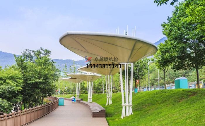 膜結(jié)構(gòu)景觀是用輕質(zhì)高強(qiáng)度柔性薄膜材料與支撐體系相結(jié)合形成的具有剛度和穩(wěn)定曲面、可以承受載荷,能夠負(fù)荷大空間的結(jié)構(gòu)形式。