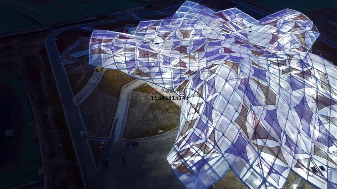 7、對轉(zhuǎn)角和褶皺區(qū)域進行局部張拉調(diào)整,固定膜面和節(jié)點;完成雨水系統(tǒng)安裝和防水覆蓋;