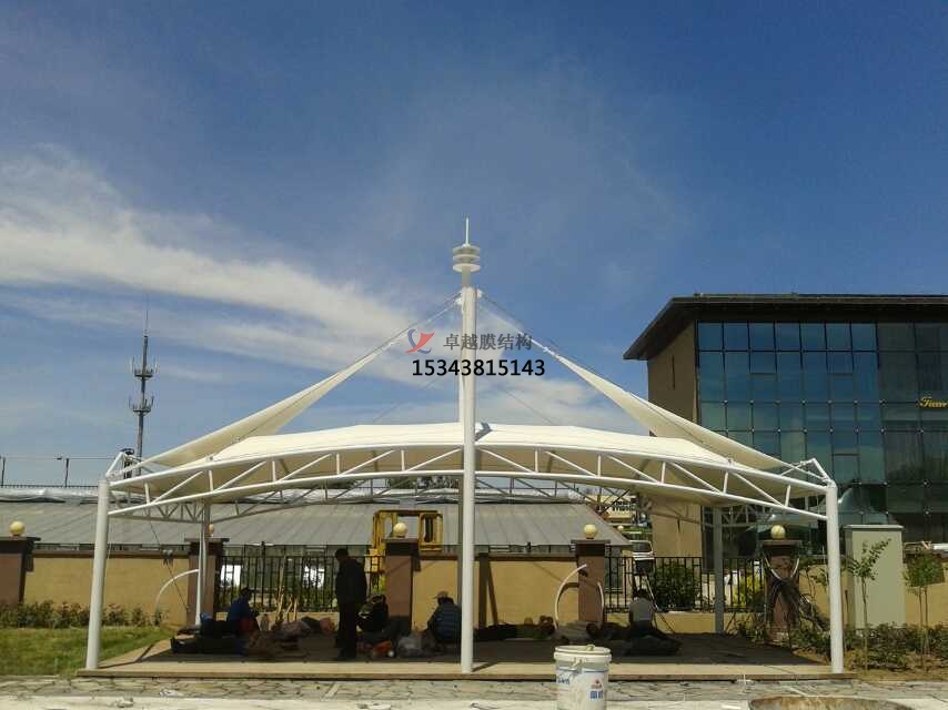 6、景觀設(shè)施:膜結(jié)構(gòu)以其特殊的建筑表現(xiàn)手法,主要體現(xiàn)在造型、漫射透光性、豐富多彩,可廣泛應(yīng)用于入口、標(biāo)志性小品 、步行街、停車(chē)場(chǎng)等,其他建筑特性無(wú)須較高要求。