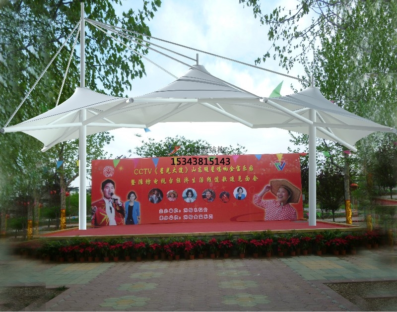 近年來(lái),隨著建筑空間觀念的日益深化以及科學(xué)手段的不斷提高,膜結(jié)構(gòu)已是現(xiàn)代建筑環(huán)境學(xué)發(fā)展的主流。它可以構(gòu)成單曲面,多曲面等不同建筑結(jié)構(gòu)形式,滿足了建筑師們對(duì)建筑與美學(xué)高度統(tǒng)一的要求。 由于膜材的光透性,白天陽(yáng)光可以透過(guò)膜材形成漫射光,使舞臺(tái)下如同自然,能很好地節(jié)約能源。夜間彩燈打射形成的絢爛景觀也讓市民體驗(yàn)到不一樣的感覺(jué)。膜材具有防水 性和遮陽(yáng)效果,而不受到日曬雨淋,因此膜結(jié)構(gòu)舞臺(tái)能創(chuàng)造出與自然環(huán)境相媲美的空間形式。
