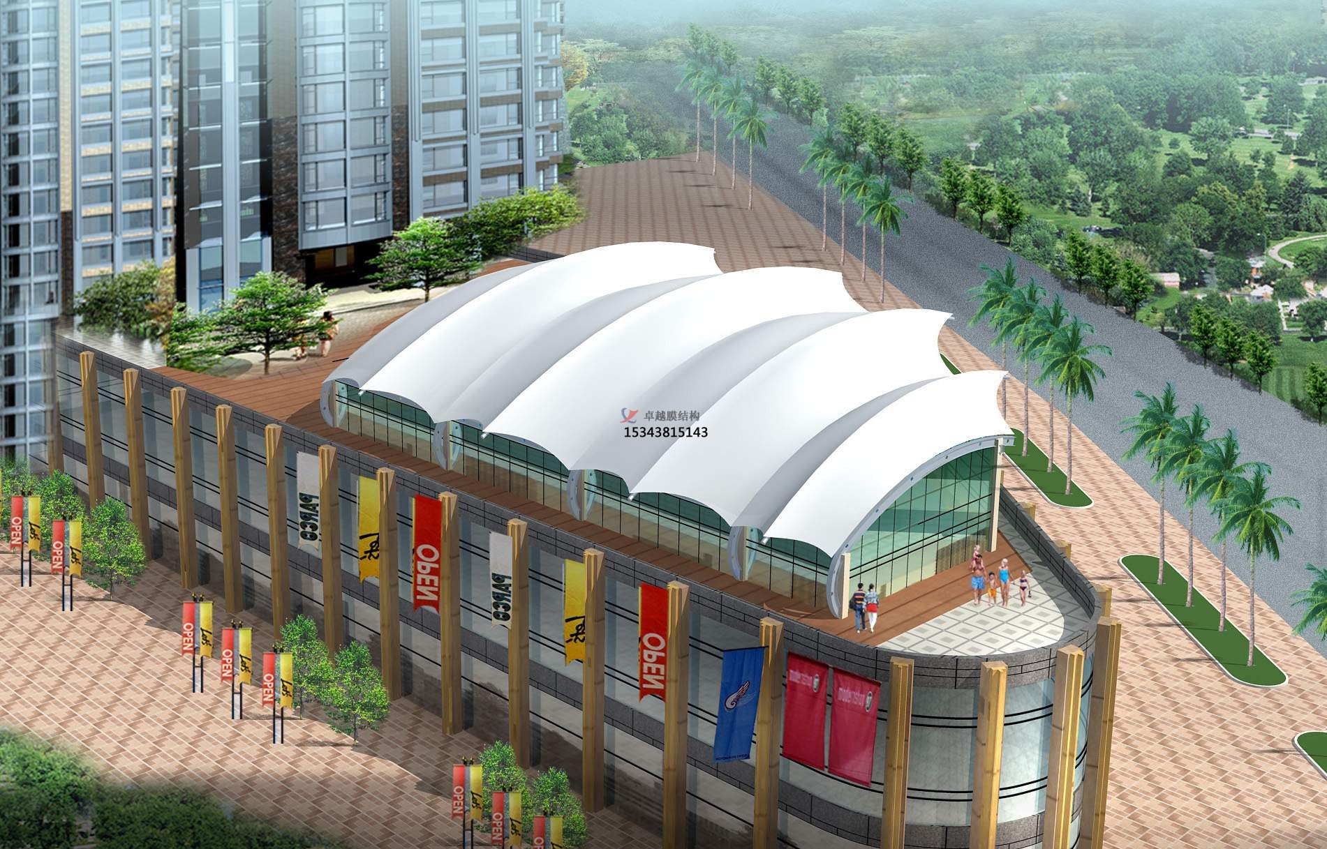 三,對(duì)于膜結(jié)構(gòu)景觀的安裝要考慮到天氣狀況,如條件比較惡劣,比如風(fēng)力較大、雨水較多的時(shí)候應(yīng)該停止施工,待惡劣天氣過后再重新進(jìn)行。因?yàn)轱L(fēng)力較大的話,膜面以及下面的支柱容易出現(xiàn)顫動(dòng),既影響施工效果,也影響人員的安 全。而雨水較多也容易使雨水在膜面上堆積。