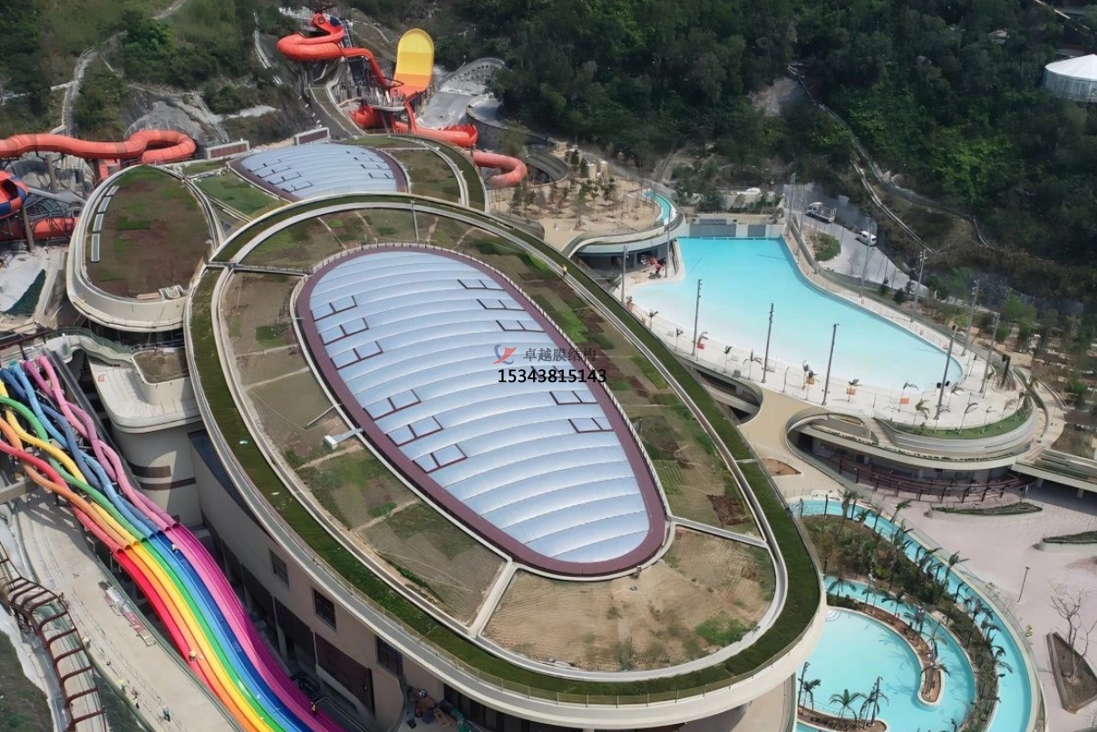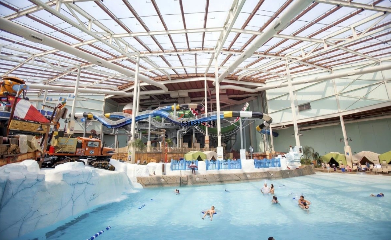 輕盈透明的膜材如同巨大的泡泡,溫柔包裹水上樂(lè)園的一角。不僅有效阻擋紫外線,還能通過(guò)膜材的透光性,讓自然光柔和灑落,營(yíng)造出夢(mèng)幻般的氛圍。孩子們?cè)谂菖菹骆覒?,仿佛置身于童話世界,安全又有趣?br />