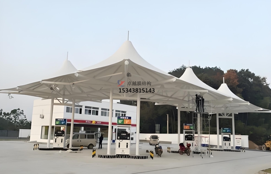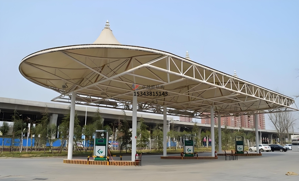 膜結(jié)構(gòu)頂棚能夠塑造出豐富多樣、極具現(xiàn)代感的造型。它既可以呈現(xiàn)出流暢的曲線形態(tài),如優(yōu)雅的風(fēng)帆,為加油站增添一份靈動(dòng)與飄逸,仿佛在訴說著能源流動(dòng)的活力;也可以設(shè)計(jì)成簡(jiǎn)潔大氣的幾何形狀,如規(guī)整的方形或多邊形組合,展現(xiàn)出一種簡(jiǎn)潔、硬朗的工業(yè)美感,與加油站的功能性相得益彰。不同的造型設(shè)計(jì)能夠契合不同加油站的定位與周邊環(huán)境風(fēng)格,成為所在區(qū)域的獨(dú)特標(biāo)識(shí)。