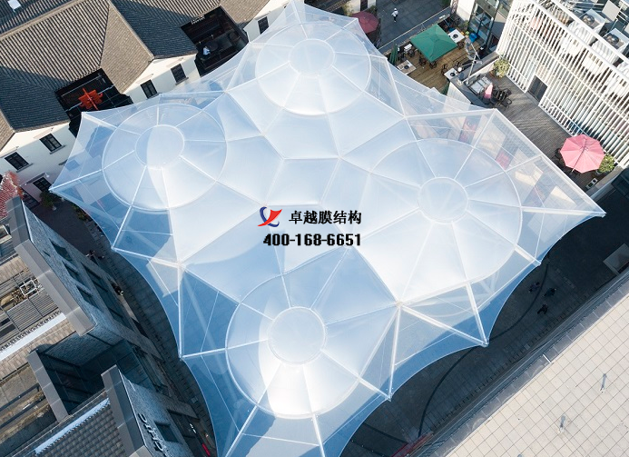 工程特點(diǎn):該項(xiàng)目是國內(nèi)好的單層ETFE加雙層氣枕膜完美嵌合的景觀雨棚建筑,利用ETFE膜材的高透光高自潔性以及雙層氣枕的隔熱能力,雨棚在具有遮陽擋雨功能的同時(shí)還可以實(shí)現(xiàn)自然采光,行人沒有傳統(tǒng)密封建筑的束縛感;另一方面,ETFE膜結(jié)構(gòu)建筑是當(dāng)代更新的建筑應(yīng)用形式之一,工程高度定制,顏值高,具有好的性,天生自帶聚集人氣光環(huán)。