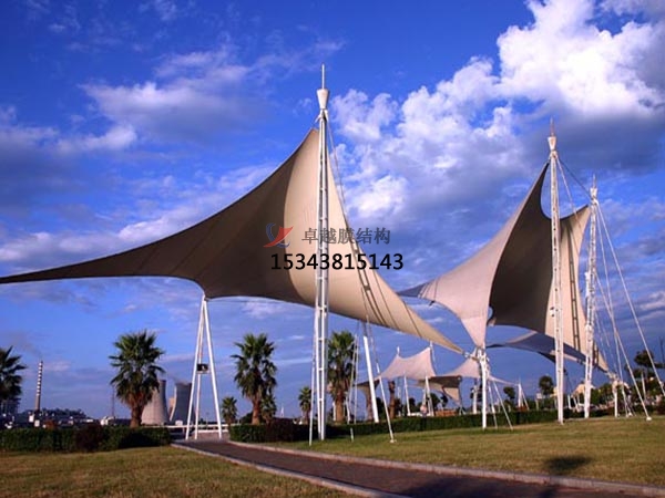 膜結構具有較好的隔熱效果,對太陽熱能可反射掉70%,膜材本身吸收了17%,傳熱13%,而透光率卻在20%以上,經(jīng)過10年的太陽光直接照射,其輝度仍能保留70%。這與它本身的材質(zhì)有關系。膜結構跨度空間大指出其因為自重輕,膜結構修建能夠不需要內(nèi)部支撐面大跨度掩蓋空間,這使大家能夠列靈活計和運用修建空間,描繪出愈加有構思的修建。所以一般膜結構建筑總能有著讓人賞心悅目的外觀設計,加上自身的實用經(jīng)濟性讓膜結構得到了更多建筑的青睞之選。