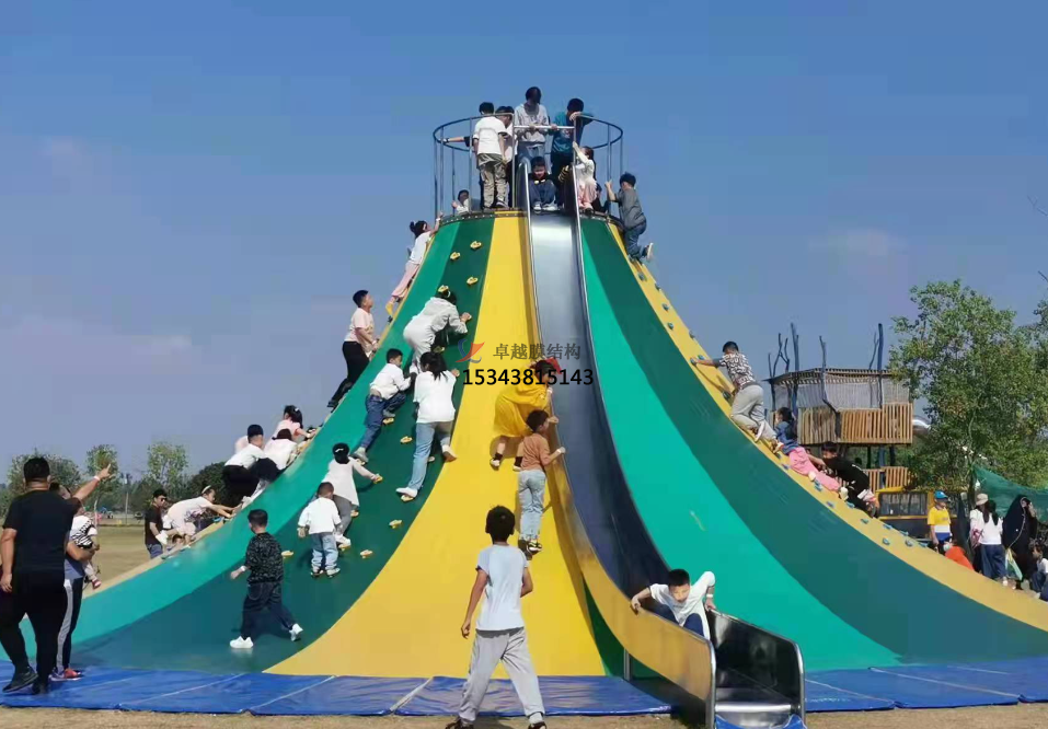 火山攀巖設(shè)備頂部可以設(shè)置滑梯,滑梯與膜結(jié)構(gòu)的火山造型相結(jié)合。當(dāng)游玩者從“火山”頂部通過滑梯滑下時,滑梯自身的落差感,可以讓游玩者感受到從高處滑下過程中的興奮感和刺激感。膜結(jié)構(gòu)的存在為滑梯的設(shè)置提供了一種創(chuàng)意性的平臺,使整個游樂體驗(yàn)更加豐富多樣。