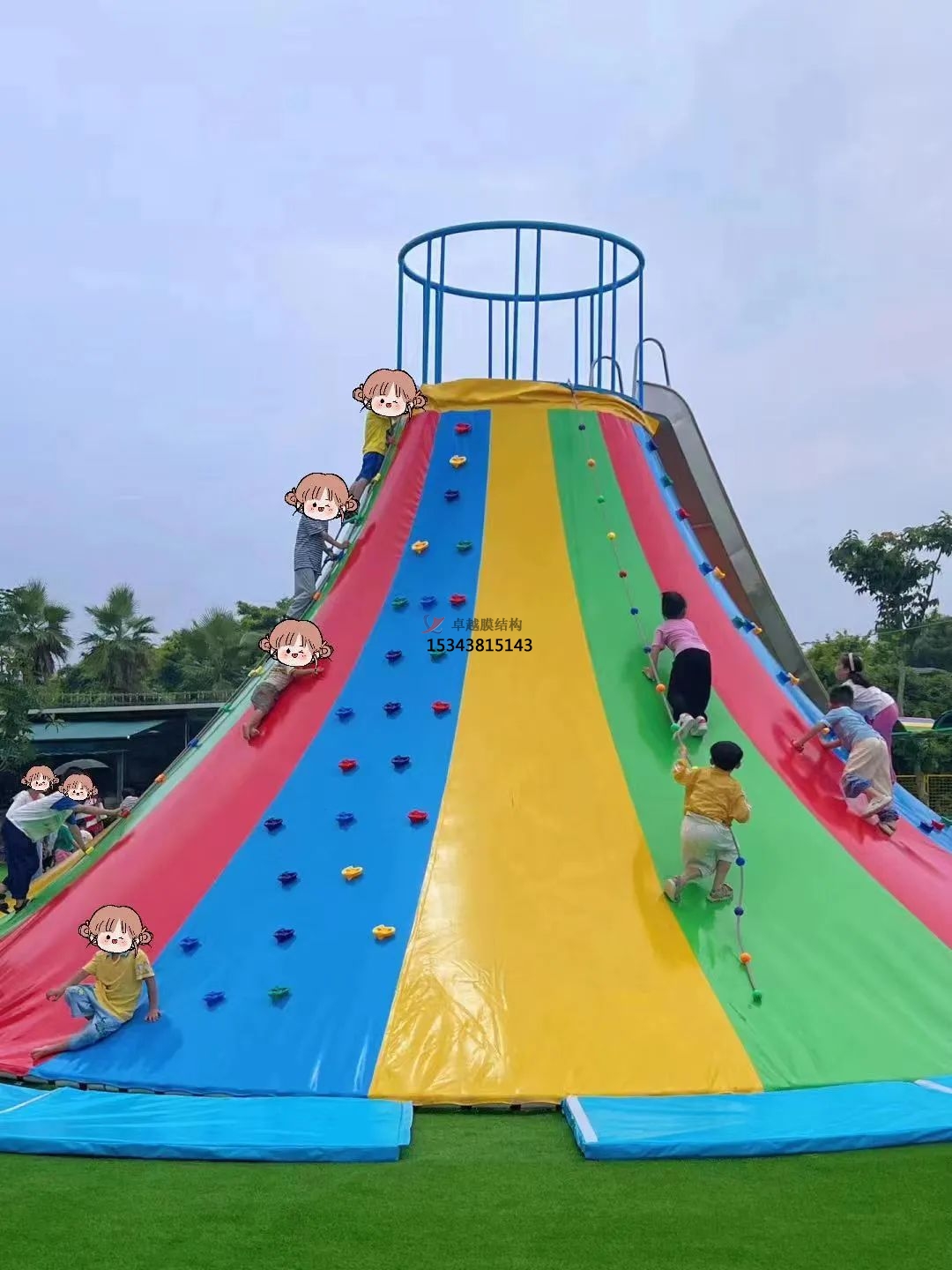 小朋友們可以從底部貼緊“火山”,雙手抓住巖石向上攀登,當(dāng)成功攀巖到山頂時,可以從“火山”頂部通過滑梯或者“火山”表面滑下來。