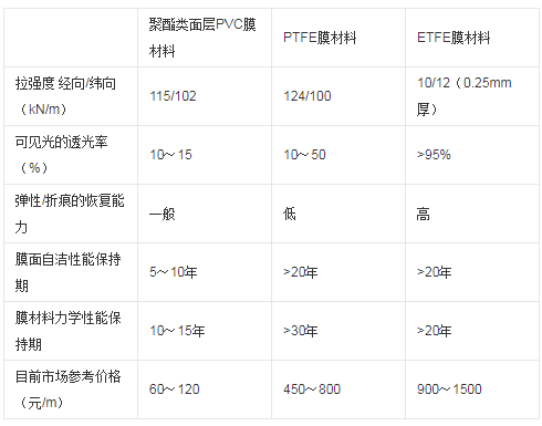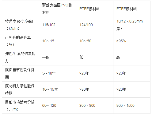 ETFE、PVC和PTEF織物膜材料的部分性能比較