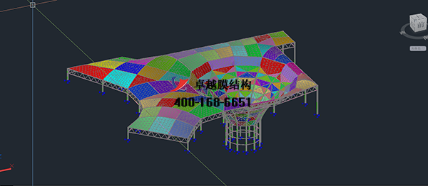 膜結(jié)構(gòu)設(shè)計(jì)時(shí),應(yīng)在滿足膜面應(yīng)力平衡狀態(tài)的條件下,使結(jié)構(gòu)體系保持穩(wěn)定。還應(yīng)考慮使用階段局部膜片破壞或局部索退出工作,以及對(duì)不同部位膜單元進(jìn)行二次張拉或更換對(duì)整體結(jié)構(gòu)的影響。