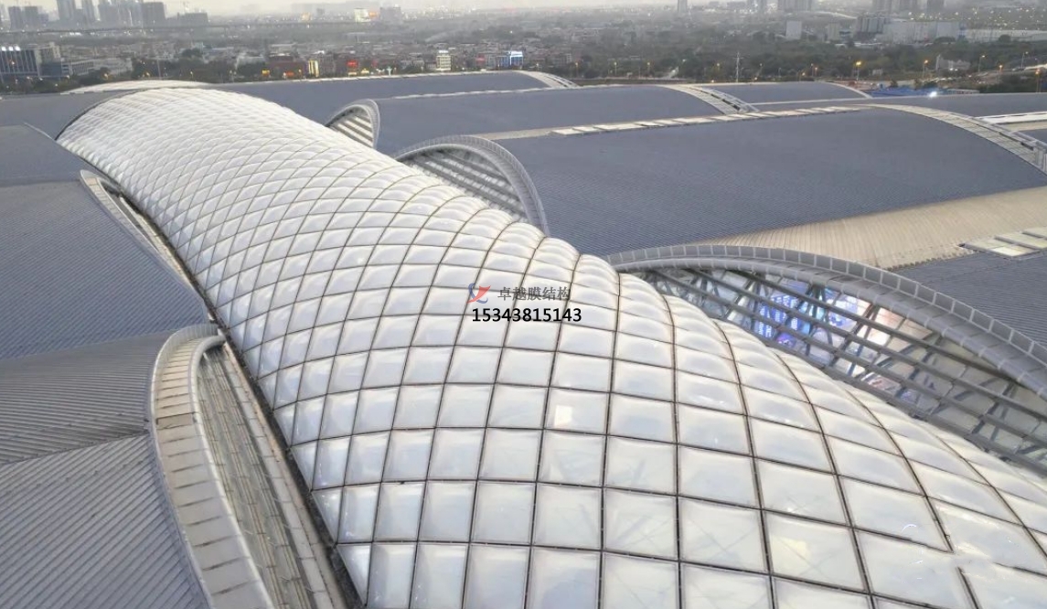 高鐵站膜結構是一種新型的建筑結構形式,它采用高強度柔性薄膜材料與支撐體系相結合,通過一定的技術手段,使其內部產生一定的預張力,從而形成具有一定剛度和穩(wěn)定性的空間結構體系。這種結構形式具有重量輕、跨度大、造型美觀、施工速度快等優(yōu)點,能夠滿足高鐵站大空間、大跨度的建筑需求。