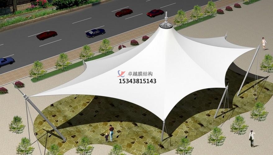 張拉式張拉膜景觀以膜材、鋼索及支柱構(gòu)成,利用鋼索與支柱在膜材中導(dǎo)入張力以達(dá)到安定的效果。除了可以實(shí)踐而且還具有創(chuàng)意,除了具有創(chuàng)新且美觀的造型外,也是更能展現(xiàn)張拉膜景觀精神的構(gòu)造形式。大型跨距空間也多采用了以鋼索與壓縮材構(gòu)成鋼索網(wǎng)來支撐上部膜材的形式。因此施工精度要求高,結(jié)構(gòu)性能強(qiáng),而且具有豐富的表現(xiàn)力,所以造價(jià)略高于骨架式張拉膜景觀。