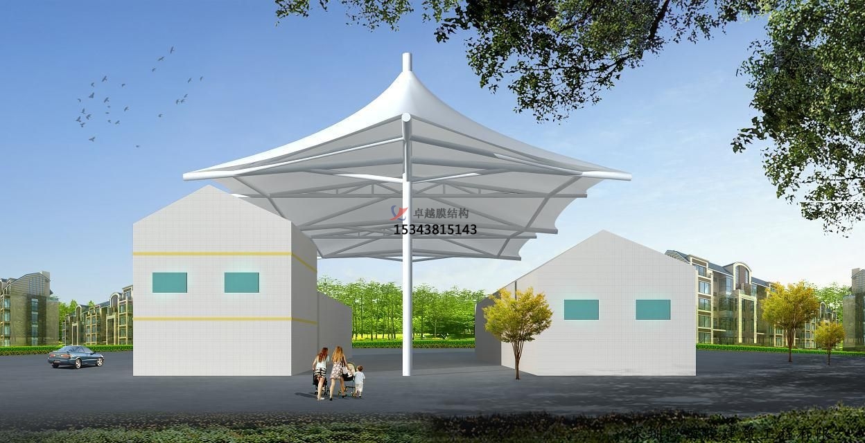 三、跨度大。商業(yè)廣場雨棚搭建中使用的膜材料很輕,每平方米的重量只有1公斤左右,因此膜結(jié)構可以從根本上克服傳統(tǒng)結(jié)構在大跨度(無支撐)建筑上實施所遇到的困難,并能創(chuàng)造開闊的無遮擋可視空間,有效增加空間使用面積。