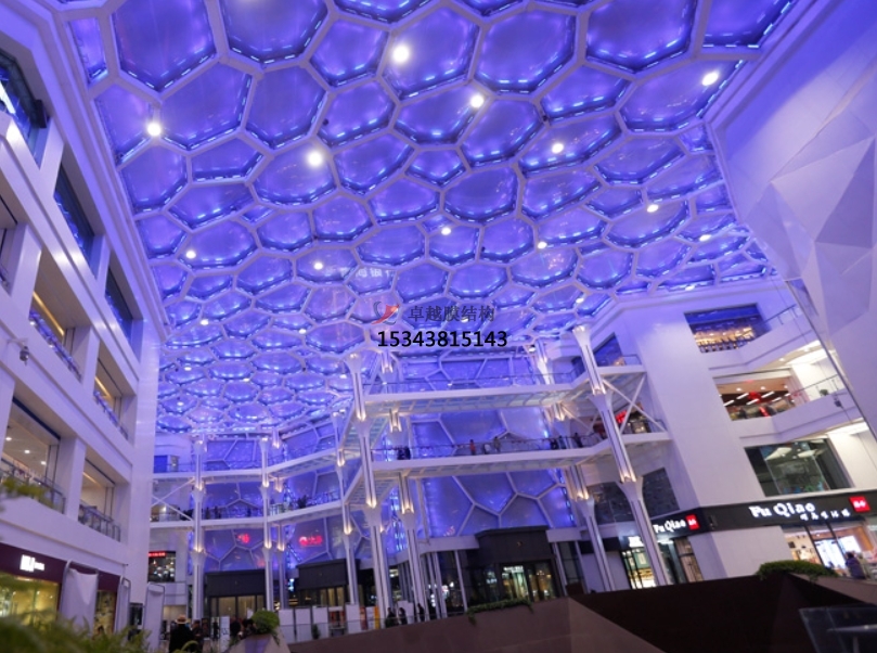 簡(jiǎn)介:大家如果去大型的商場(chǎng)可能會(huì)注意到,其廊道或者大廳頂部都是采用了半透明或者透明的建筑材料,這種設(shè)計(jì)不僅滿足了商場(chǎng)對(duì)于自然采光的要求,使得整個(gè)商場(chǎng)看上去更加的敞亮,而且在白天還能大大的節(jié)省照明設(shè)施的運(yùn)行時(shí)間,降低了能耗,以前在膜結(jié)構(gòu)沒(méi)有大規(guī)模應(yīng)用的時(shí)候,實(shí)現(xiàn)這種效果,都是采用了陽(yáng)光板或者鋼化玻璃等材料,這些材料都有明顯的缺點(diǎn),比如說(shuō)陽(yáng)光板受陽(yáng)光直射的作用老化速度會(huì)大大加快,鋼化玻璃自重較重對(duì)于支承結(jié)構(gòu)要求高,而且安全性是個(gè)難點(diǎn),但是膜結(jié)構(gòu)的出現(xiàn)解決了傳統(tǒng)材料的種種弊端,PTFE及ETFE膜材不僅可以實(shí)現(xiàn)透光性,而且自重輕,安全性更高,特別是ETFE其高自潔、高透光特性已經(jīng)成為了大型商業(yè)街區(qū)穹頂天幕的首選。
