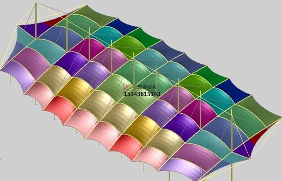 索膜結(jié)構(gòu)和膜結(jié)構(gòu)的核心構(gòu)成:索膜解構(gòu)是由索網(wǎng)系統(tǒng)和膜材構(gòu)成的,膜結(jié)構(gòu)是由膜材和支撐體系構(gòu)成。在索膜解構(gòu)中,索網(wǎng)系統(tǒng)承擔(dān)主要的拉力,通過張拉形成穩(wěn)定的幾何形狀(如馬鞍形、傘形等),是結(jié)構(gòu)的 “骨架”,由膜材覆蓋在索網(wǎng)上,除了承受自身荷載外,還與索網(wǎng)共同抵抗外部荷載(如風(fēng)、雪)。索網(wǎng)的存在使結(jié)構(gòu)剛度更高,可跨越更大跨度,形態(tài)更靈活,常用于需要復(fù)雜曲面或大空間的場景。在膜結(jié)構(gòu)中,膜材是主要材料,多為高分子復(fù)合材料(如PVDF膜、PTFE膜),依賴自身張力或外部支撐保持形態(tài)。支撐體系包括骨架(如鋼結(jié)構(gòu)、鋁合金框架)、桅桿、拉索等,但膜材是受力主體。特點(diǎn)能更強(qiáng)調(diào)膜材的獨(dú)立性,支撐體系相對簡單,結(jié)構(gòu)形式更輕量化,適用于中小型跨度或?qū)υ煨陀刑厥庖蟮膱鼍啊?br />