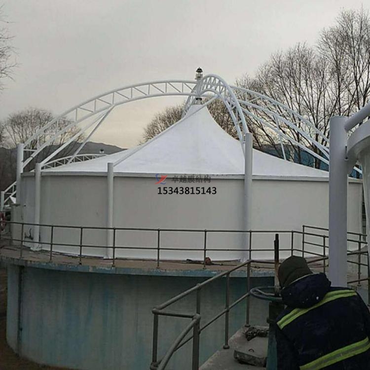 鋼架反吊膜結(jié)構(gòu)是專(zhuān)門(mén)用于污水池加蓋密閉的一種膜結(jié)構(gòu)形式,結(jié)構(gòu)形式新穎,防腐耐霉,由鋼結(jié)構(gòu)、膜結(jié)構(gòu)及安裝輔件構(gòu)成,根據(jù)不同污水池現(xiàn)場(chǎng)條件進(jìn)行個(gè)性化設(shè)計(jì)安裝。鋼結(jié)構(gòu)在外部形成穩(wěn)定受力結(jié)構(gòu),膜材料反吊與機(jī)構(gòu)內(nèi),隔絕廢氣對(duì)剛架構(gòu)的腐蝕。鋼架反吊膜分為圓形反吊膜和方形反吊膜,其中方形反吊膜又分為拱形及吊帽結(jié)構(gòu)。