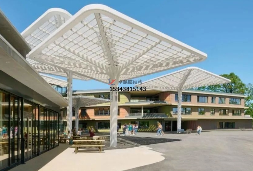 膜結構景觀可以采用多種形狀和顏色的膜材料,通過張力和支撐系統(tǒng)來實現(xiàn)懸掛和張拉的效果,其設計靈感來自于自然界中的形態(tài)和結構,如植物葉片、動物骨骼等,常見的應用包括遮陽棚、入口門廊、地標建筑等等。