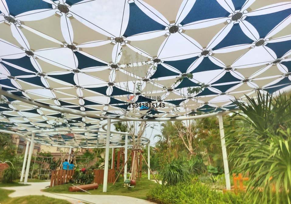 膜結構景觀的材料和設計特點使得它具備良好的隔熱性能。在夏季,它可以減少太陽輻射的進入,降低室內(nèi)溫度,減輕空調(diào)負荷。在冬季,它可以保持室內(nèi)熱量,減少能源消耗;而且相對于傳統(tǒng)建筑物,膜結構景觀的施工周期較短。膜材料的制作和安裝相對簡便,可以在較短的時間內(nèi)完成建設,減少施工對周邊環(huán)境的干擾。除此之外,因為膜結構景觀還具有很高的抗拉強度和耐候性能,能夠承受風力和其他天氣因素的沖擊,通過支撐結構和張拉系統(tǒng)的精心設計,能夠在惡劣天氣條件下保持穩(wěn)定,具有良好的抗風能力,減少對風的阻力,減輕膜材料的受力。另外,膜材料本身具有優(yōu)異的防水性能,能夠有效地防止雨水滲透,而且膜結構景觀的設計通??紤]到排水系統(tǒng),可以迅速將雨水導出,避免積水對結構和材料造成損害。