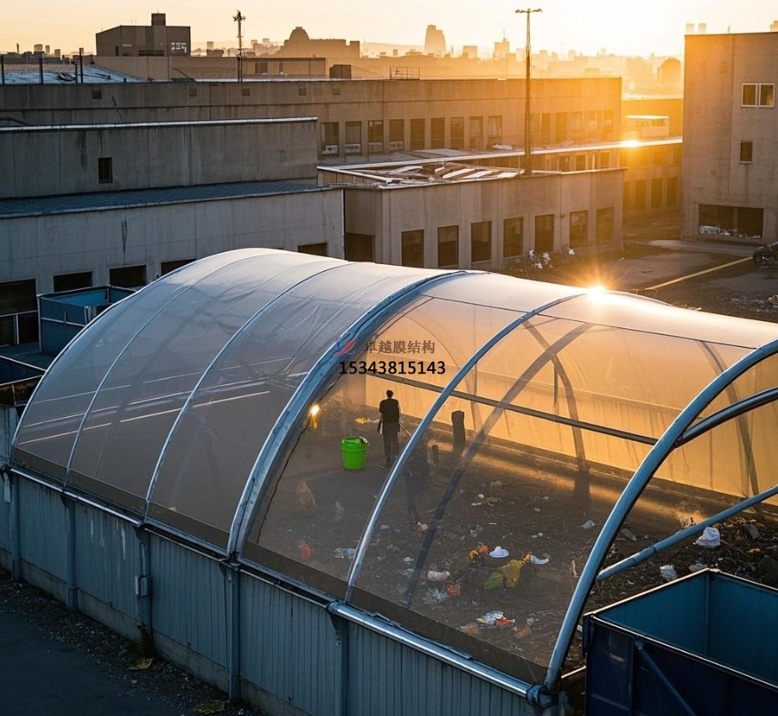 在城市生活垃圾中轉(zhuǎn)站中,膜結(jié)構(gòu)罩棚應(yīng)用普遍。如北京某區(qū)的多個(gè)生活垃圾中轉(zhuǎn)站,采用充氣式膜結(jié)構(gòu)罩棚,不僅解決了垃圾異味擾民問(wèn)題,還提升了垃圾轉(zhuǎn)運(yùn)效率,周邊居民對(duì)環(huán)境滿意度顯著提高。