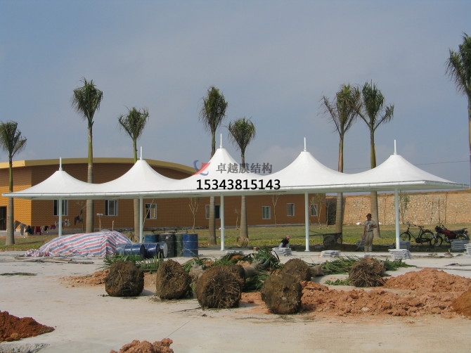 某看臺工程采用張拉膜景觀,形式新穎、活潑。鋼架與索和膜合理結(jié)合,膜頂平滑過渡,結(jié)構美觀、輕巧、整體造型相互輝映,自具一格。以下介紹的是該張拉膜景觀工程的設計步驟及準則,為以后工程的設計提供了參考。