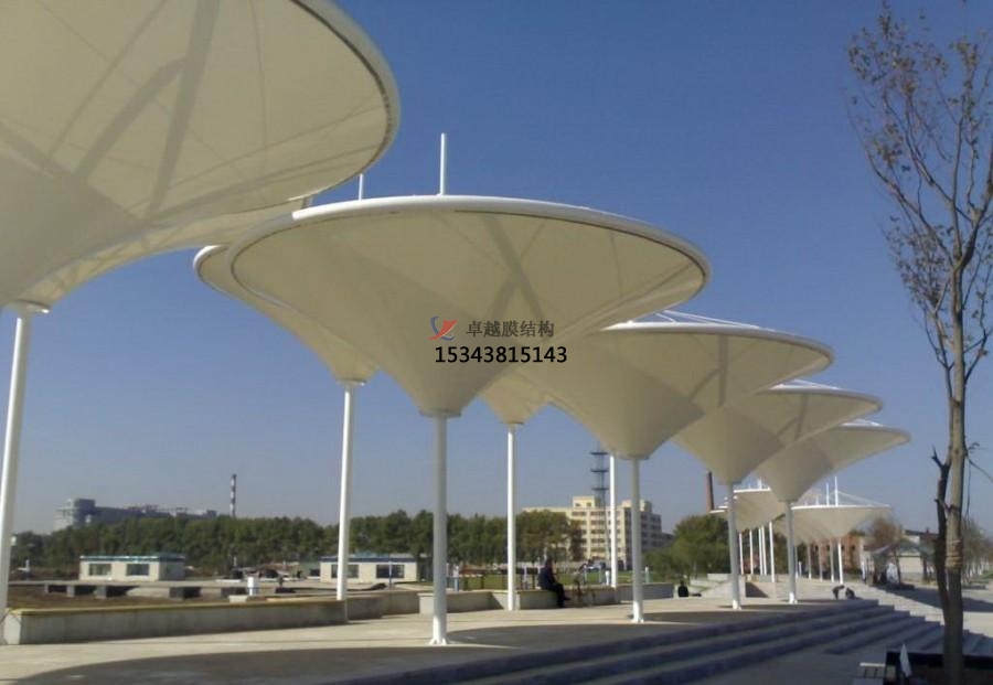 膜結(jié)構(gòu)景觀又叫張拉膜結(jié)構(gòu)景觀,是21世紀(jì)更具代表性的建筑形式。打破了純直線建筑風(fēng)格的模式,能承受一定外荷載的空間結(jié)構(gòu)形式。其造型自由、輕巧、柔美,充滿力量感,阻燃、制作簡易、安裝快捷、節(jié)能、易于施工、使用安全等優(yōu)點,同時給建筑設(shè)計師提供了更大的想象和創(chuàng)造空間,因而使它在世界各地受到廣泛應(yīng)用。