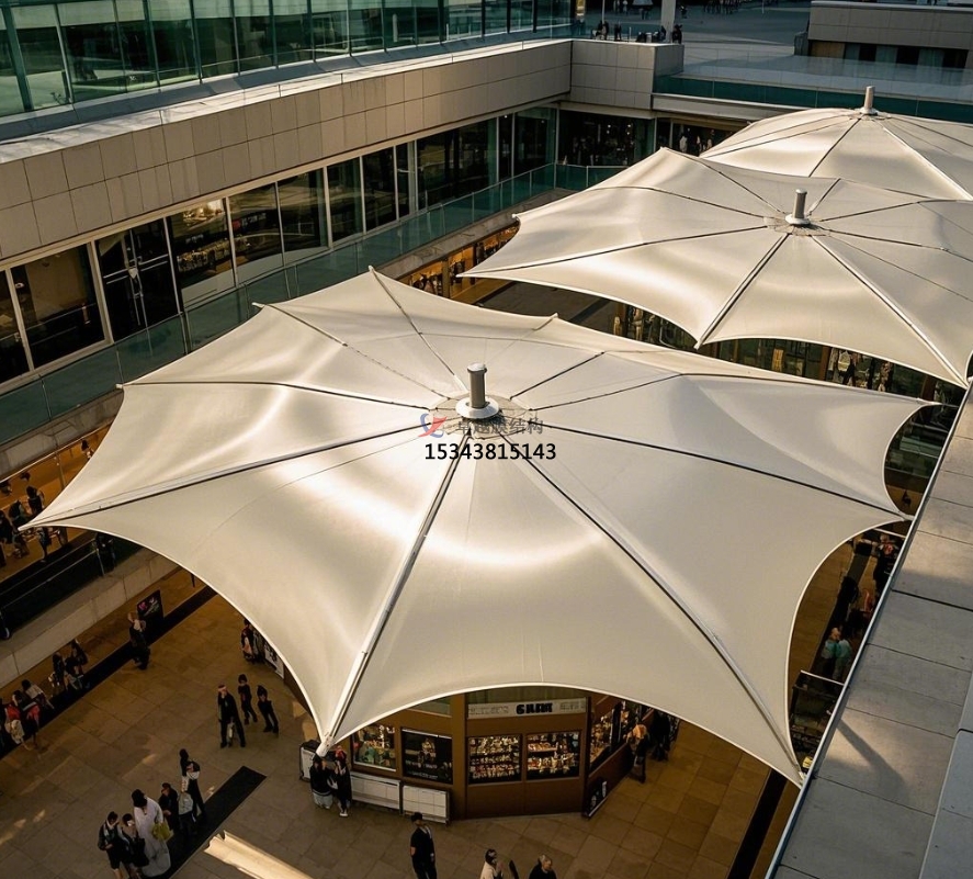 露天步行商業(yè)街的公共座椅旁,膜結(jié)構(gòu)遮陽傘是常見的配置。它與傳統(tǒng)可移動遮陽傘不同,采用先預埋基礎,再搭建鋼構(gòu),最后張拉膜材的方式固定。其造型豐富多樣,顏色可根據(jù)整體環(huán)境定制,不僅具備出色的抗紫外線、抗老化性能,使用壽命長,而且自潔性好,為商業(yè)街增添了一抹亮麗色彩,成為實用與美觀兼具的景觀設施。