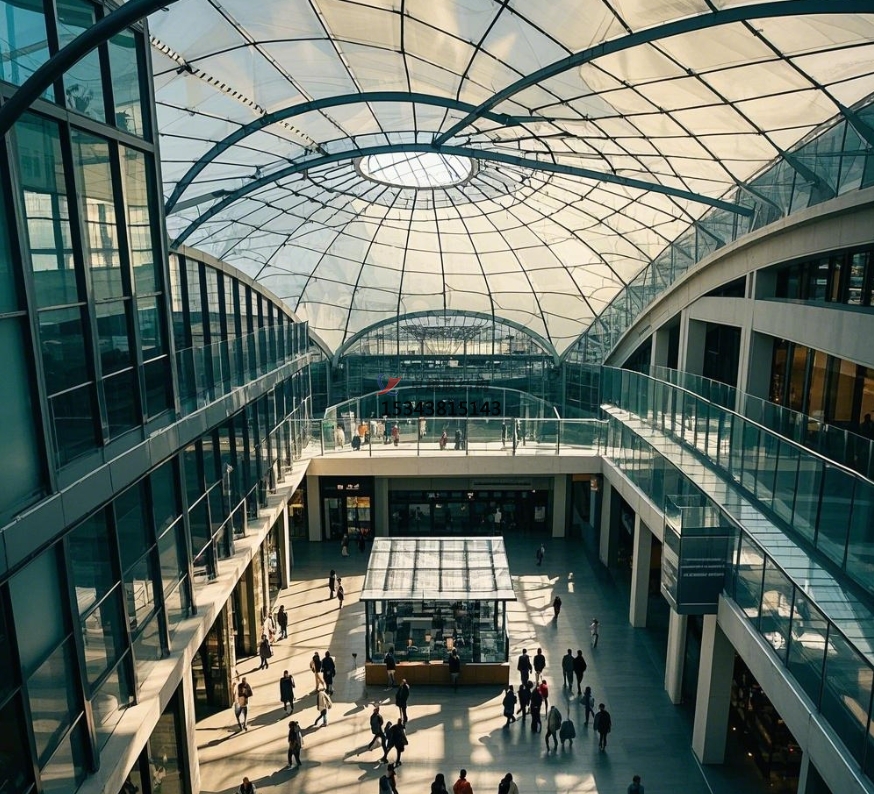 在大型商業(yè)廣場的廊道或大廳頂部,常能見到膜結(jié)構(gòu)穹頂與天幕的身影。以往,實現(xiàn)自然采光多依賴陽光板或鋼化玻璃,然而陽光板易老化,鋼化玻璃自重過大且存在安全隱患。膜結(jié)構(gòu)的出現(xiàn)改變了這一局面,PTFE 及 ETFE 膜材透光性佳、自重輕、安全性高,尤其是 ETFE,其高自潔、高透光特性,讓穹頂天幕在白天引入充足自然光線,節(jié)省照明能耗,夜晚在燈光映照下,又營造出如夢如幻的氛圍,為顧客帶來獨特的購物體驗。