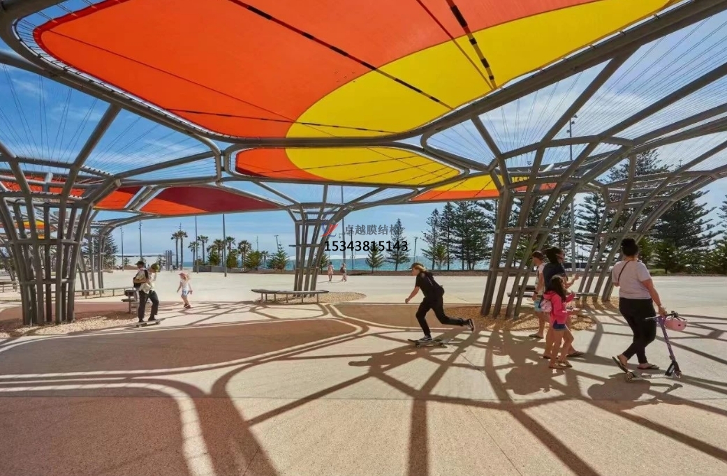 未來的景觀棚膜結構將不再僅僅局限于單一的遮陽避雨功能,而是會朝著多功能融合的方向發(fā)展。比如,在景觀棚內集成光伏發(fā)電系統(tǒng),將太陽能轉化為電能,實現(xiàn)能源的自給自足;或者結合聲學設計,使其具備良好的隔音效果,可用于舉辦小型音樂會、演講等活動;還可以與水幕景觀、噴泉等水景元素相結合,打造出更加豐富多彩的戶外體驗空間。
