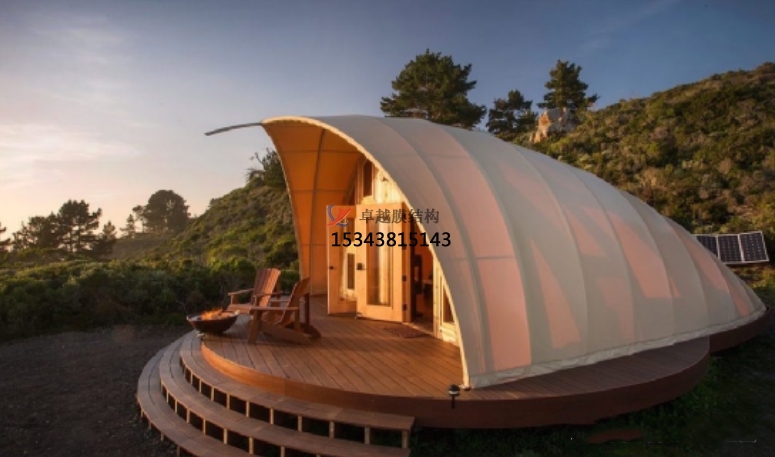 圓頂帳篷酒店:圓潤(rùn)的穹頂設(shè)計(jì)極具現(xiàn)代感,如武漢木蘭草原伊爾那非伽野奢沙漠酒店的尖頂 Glamping 帳篷。這類帳篷空間布局緊湊合理,通常配備大面積透明窗戶或天窗,既能引入充足自然光線,又方便客人觀賞戶外景色,營(yíng)造出溫馨又獨(dú)特的居住氛圍。