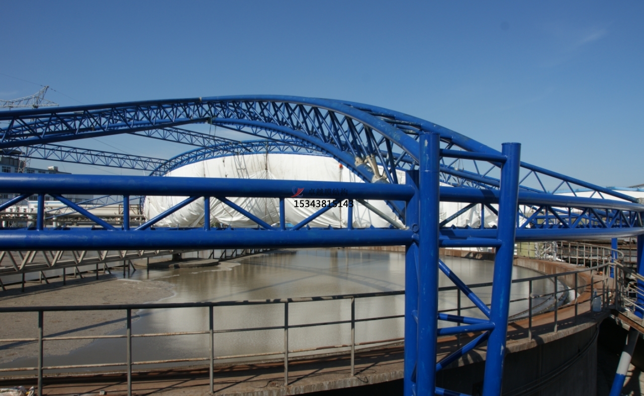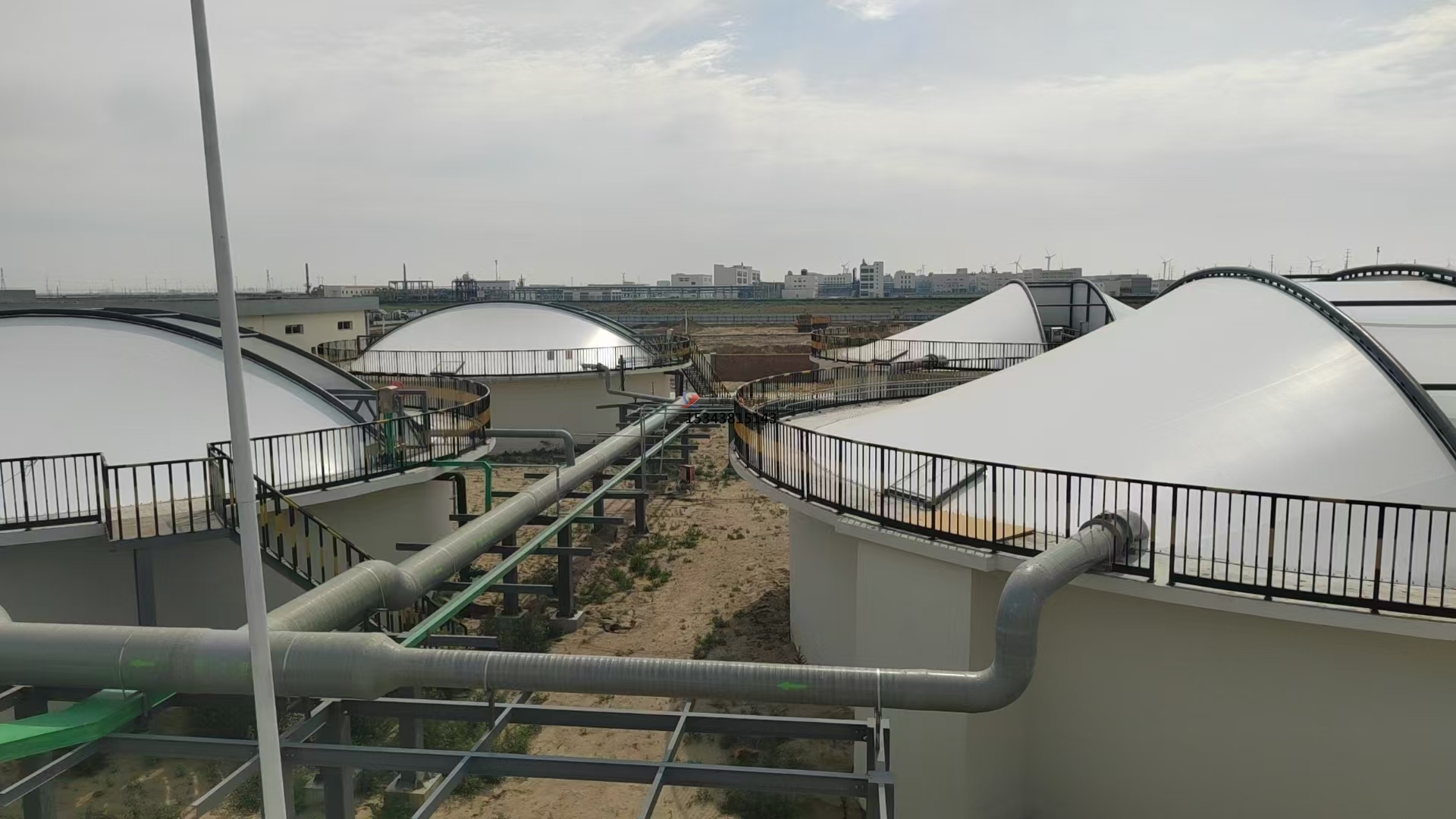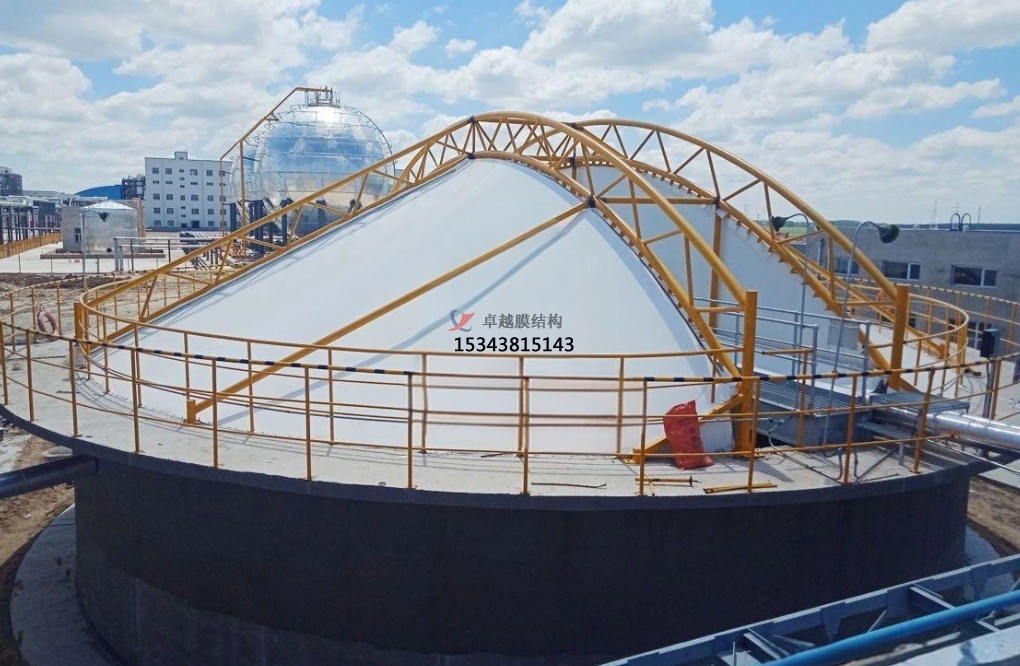 污水池反吊膜,顧名思義,是一種將薄膜材料以反吊的方式覆蓋在污水池上方的結(jié)構(gòu)。這種結(jié)構(gòu)通過鋼架或索網(wǎng)等支撐體系,將膜材料緊繃并固定于污水池上方,形成一個密閉或半密閉的空間,有效隔絕污水池內(nèi)的惡臭氣體和有害物質(zhì),防止其對外擴散,同時保護(hù)膜材料免受污水池內(nèi)腐蝕性氣體的侵蝕。