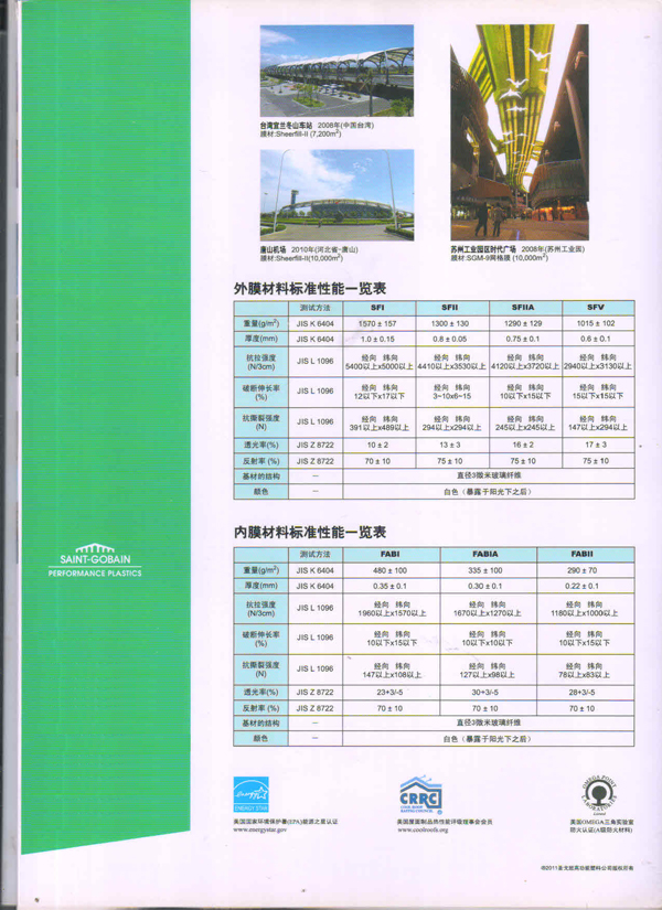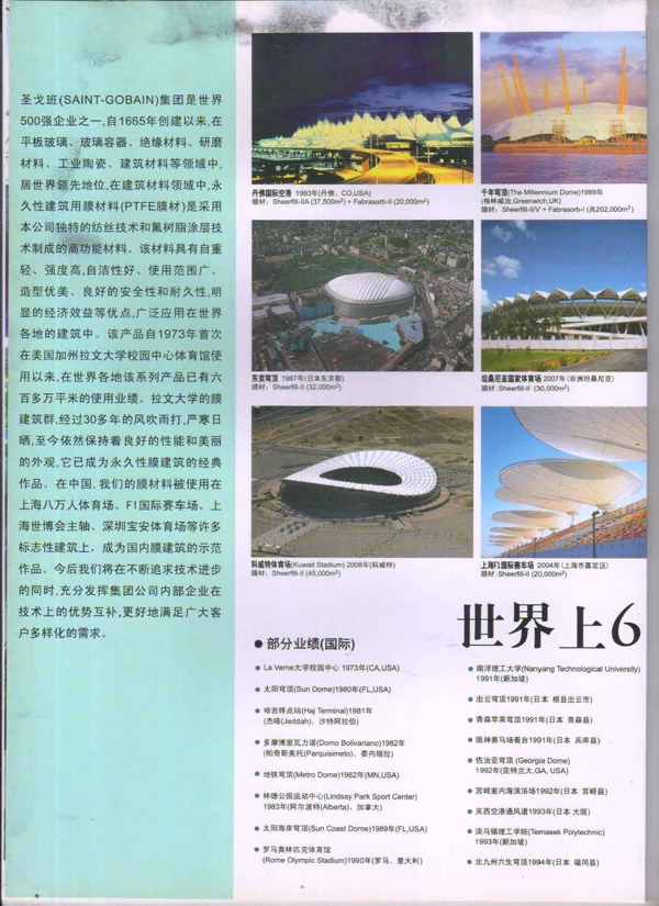圣戈班工業(yè)薄膜為市場提供高性能聚合物薄膜、微孔過濾膜、薄膜圖層、復合薄膜和壓敏膠帶等多種產(chǎn)品近40多年,在相關行業(yè)中具有領先的地位。在諸多建筑中,我們都能看到圣戈班的影子,其中就有被很好的建筑師青睞的PTFE的建筑膜,實際上它就是圣戈班SHEERFILL®建筑網(wǎng)格布。