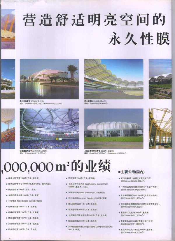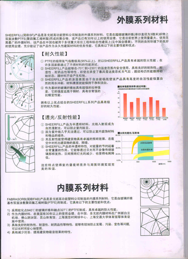 SHEERFILL產(chǎn)品能夠在-70C到+230C的溫度范團內(nèi)安全使用。具有良好的耐熱性、耐濕性、耐藥品性等特性,即使在承受了暴風雪這類惡劣天氣后,膜結(jié)構(gòu)仍然能維持初始狀態(tài),膜材料不會產(chǎn)生松弛。